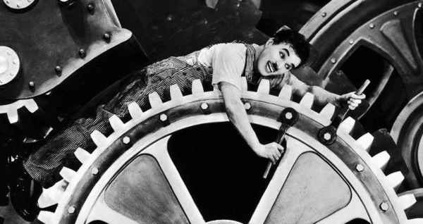 - Tiempos Modernos (1936), Charles Chaplin. La sociedad moderna vista desde la deshumanización de su personaje. < Ver película >